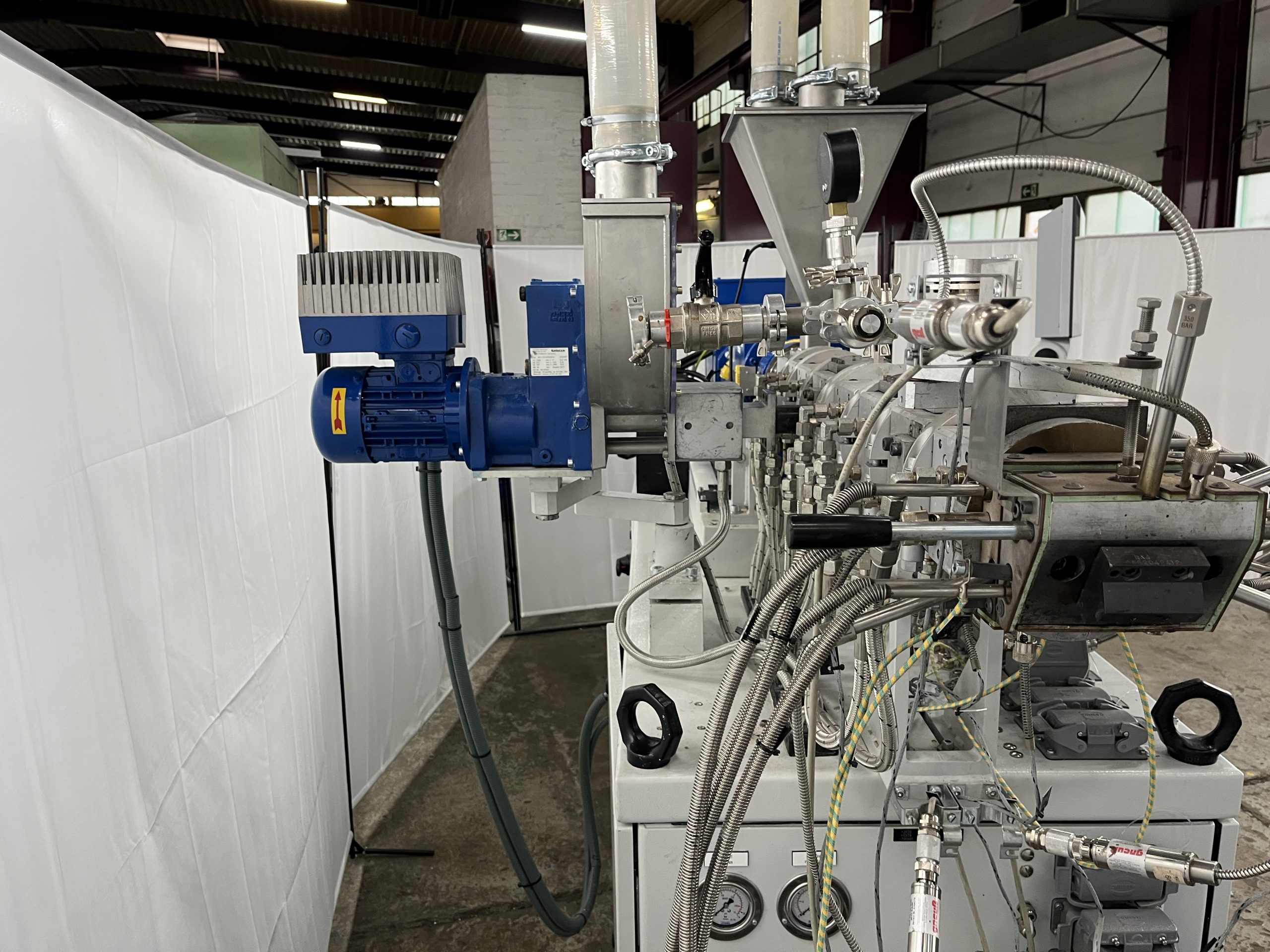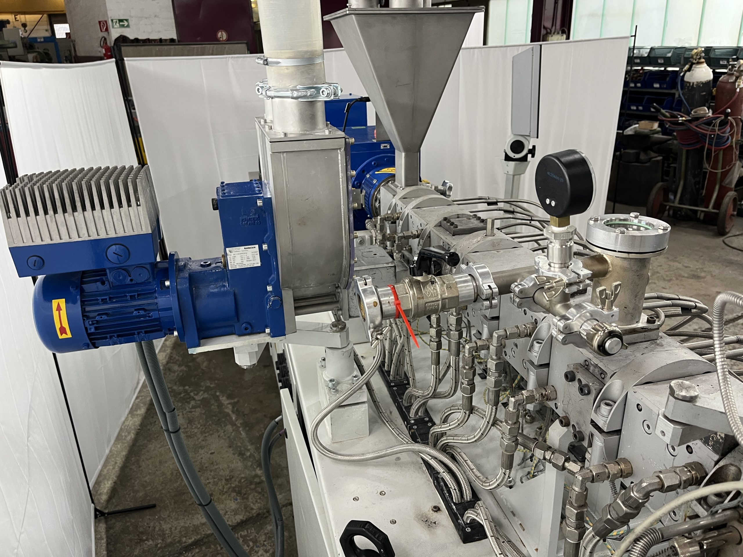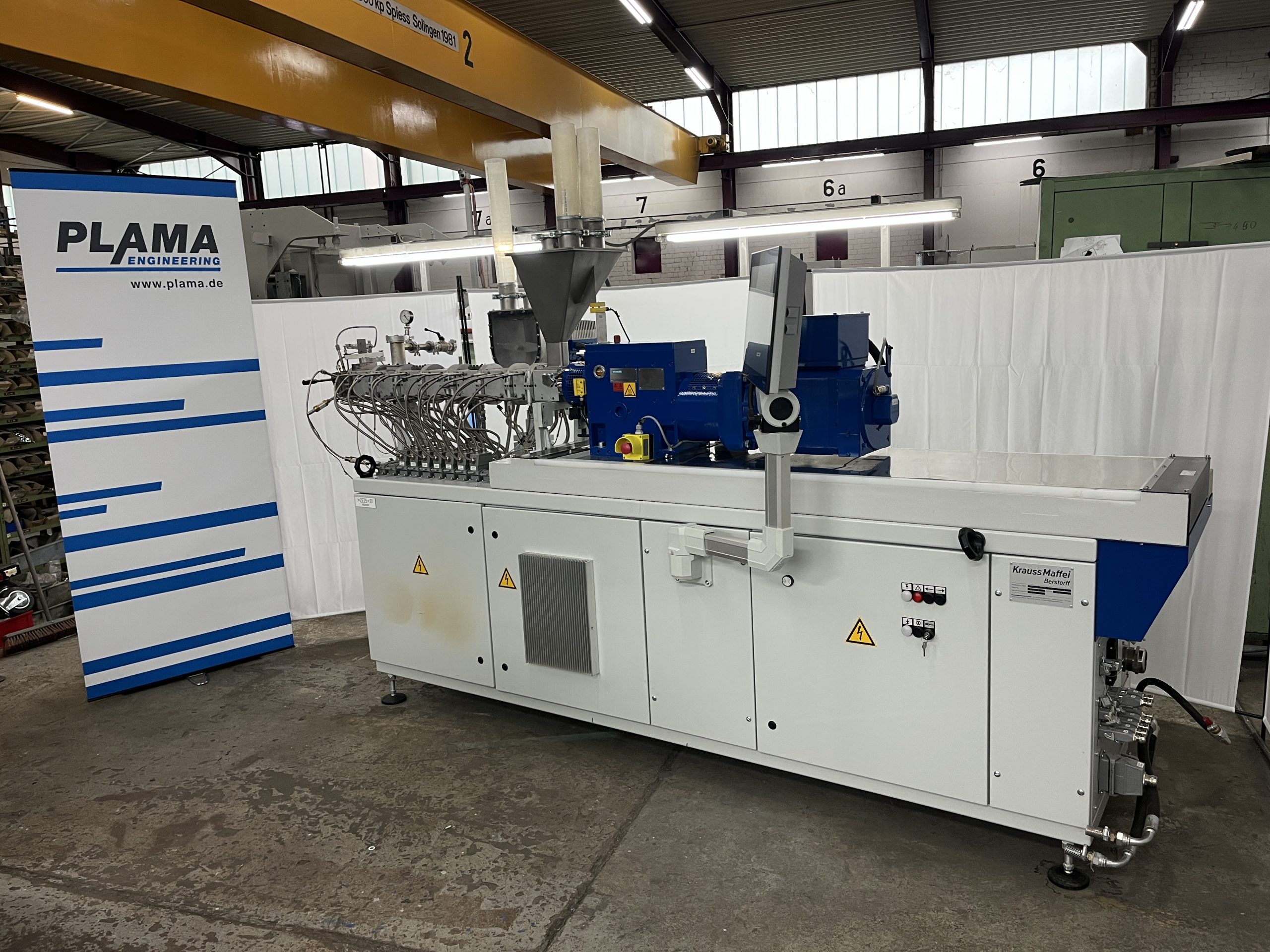 Material: PE, PP, PS, ABS // weitere Details: Gleichläufer, Vakuum-Entgasung, segmentierte Schnecken und Zylinder – Steuerung: Siemens